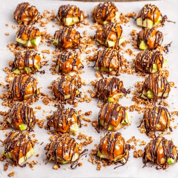 This recipe starts with crisp pretzel snaps topped with chewy caramel and fresh apple pieces, creating the classic flavor of a caramel apple in a convenient bite-sized form. Finely chopped peanuts add extra texture and a nutty flavor, while a drizzle of semisweet or dark chocolate provides a rich, decadent finish. Caramel Apple Pretzel Bites are easy to assemble, visually appealing, and perfect for gifting or sharing at parties.