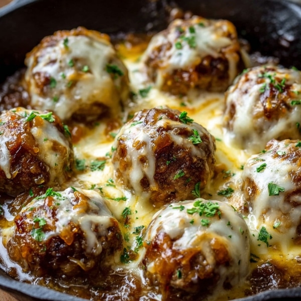 Transfer the Cheesy French Onion Meatballs to a serving platter or serve directly from the skillet for a rustic touch. Garnish with fresh parsley if desired. These meatballs pair wonderfully with creamy mashed potatoes, buttered egg noodles, or crusty bread to soak up every bit of the flavorful sauce.