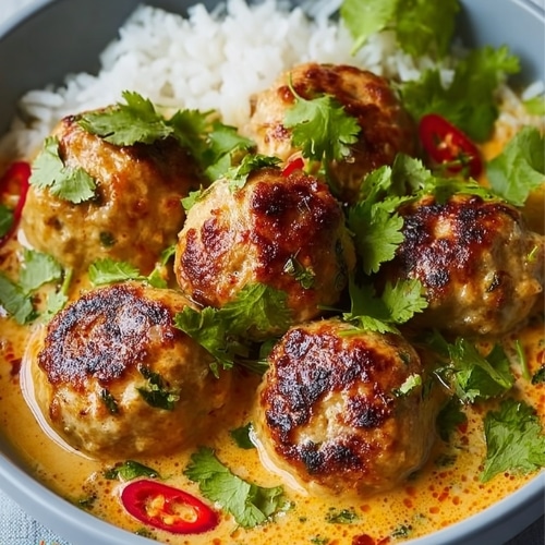 Juicy coconut chicken meatballs simmered in a creamy coconut curry sauce, packed with spices and bright lime. Perfect for weeknight dinners or a flavorful meal to impress guests.