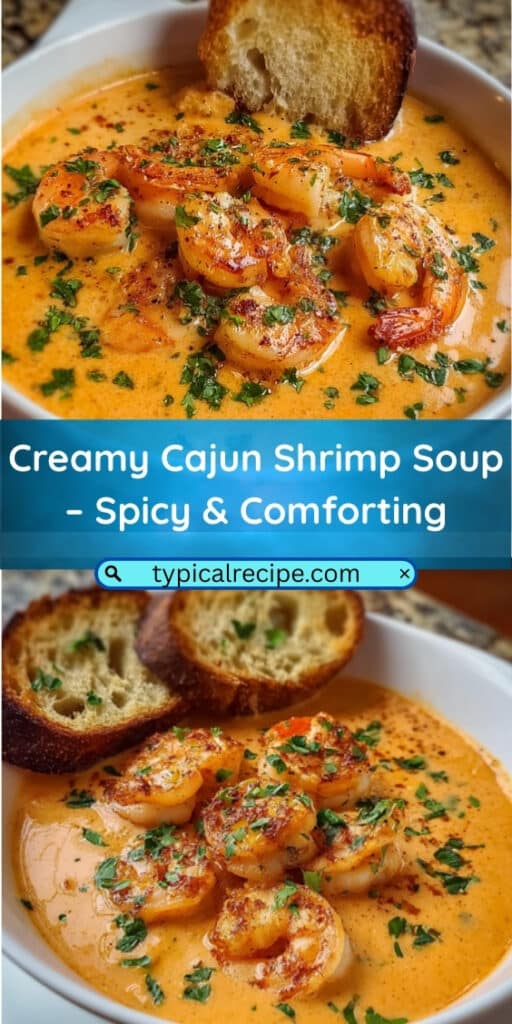 A rich and spicy Creamy Cajun Shrimp Soup featuring tender shrimp, garlic, and a velvety tomato-cream broth—perfect with crusty bread for a comforting Cajun meal.