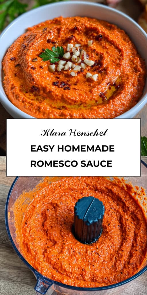 This Easy Homemade Romesco Sauce is a smooth and flavorful Spanish sauce made with roasted red peppers, almonds, garlic, sun-dried tomatoes, and olive oil. Perfect as a dip, spread, or accompaniment to meats and vegetables.