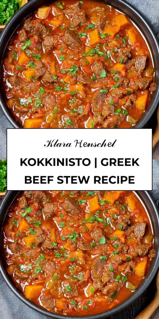 Kokkinisto is a comforting, aromatic Greek stew that elevates simple beef into a rich, flavorful meal. Its warm spices and tender beef make it perfect for family dinners or special occasions. Try it with mashed potatoes or orzo, and enjoy a hearty taste of Greece in your own kitchen.