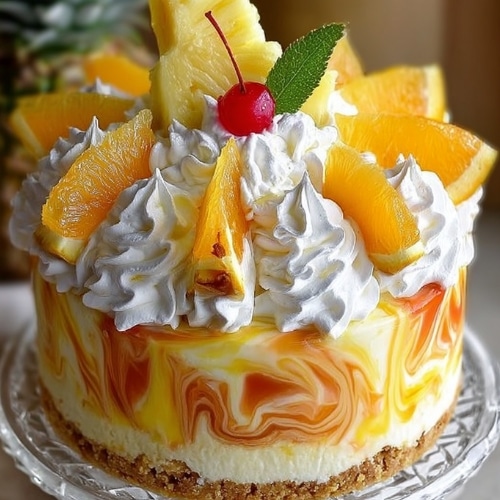 A refreshing and creamy no-bake cheesecake with a delightful orange and pineapple swirl, perfect for warm weather.