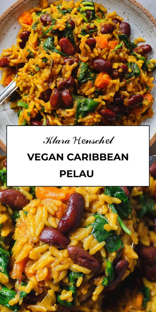 A one pot vegan Caribbean pelau filled with hearty beans and spinach for a complete meal.