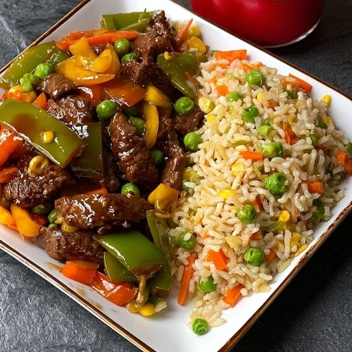 A quick and flavorful pepper steak stir-fry served with veggie-packed fried rice. Savory, colorful, and perfect for an easy weeknight meal.