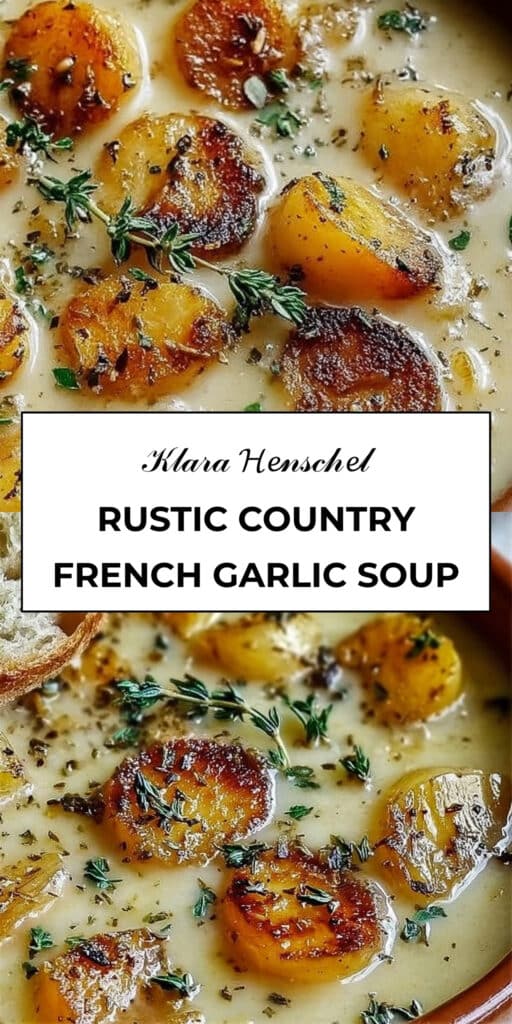 A cozy, creamy Rustic Country French Garlic Soup inspired by the French countryside. Made with slow-roasted garlic, sweet onions, and fresh thyme, perfect for chilly evenings.