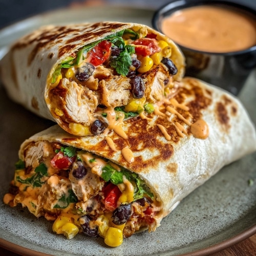 - Assemble wraps: layer rice, chicken mixture, beans, corn, cheese, and sauce on each tortilla.