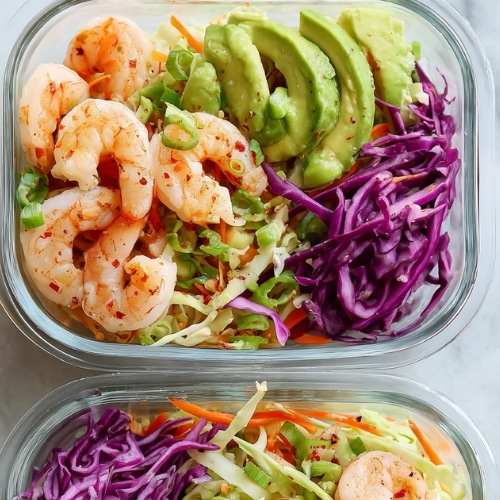 Divide the slaw mixture evenly among four bowls or meal prep containers. Top each with 3 ounces of cooked shrimp and a quarter of the avocado. Cover and refrigerate until ready to eat, or enjoy immediately.
