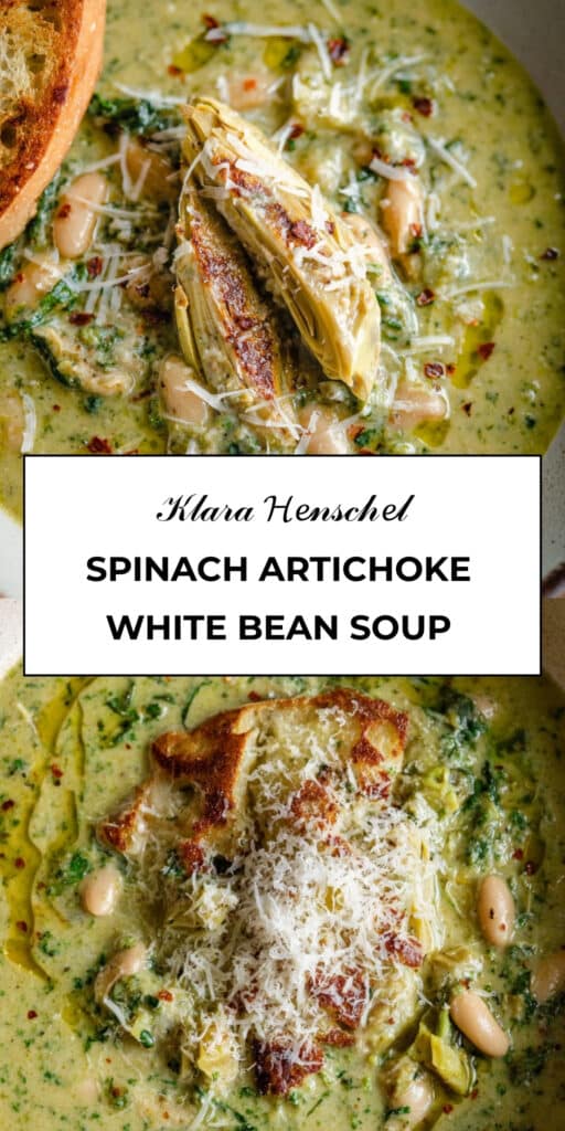 A cozy creamy spinach artichoke white bean soup that’s packed with plant-based nutrition while tasting like your favorite savory spinach artichoke dip in comforting soup form.