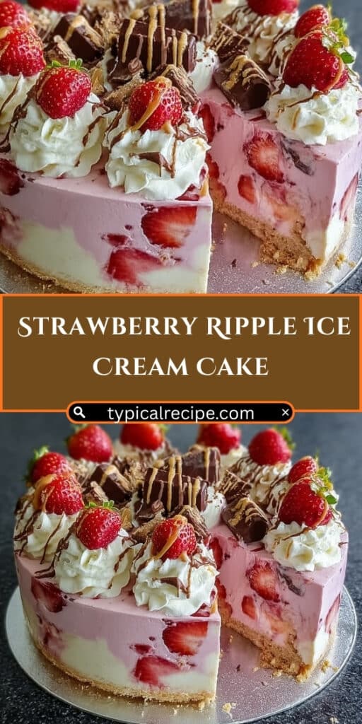 Strawberry Ripple Ice Cream Cake – a refreshing, creamy, and berrylicious no-bake dessert with a crunchy graham cracker base, silky strawberry swirl ice cream, and a fluffy whipped cream topping. Perfect for warm days, celebrations, and effortless entertaining!