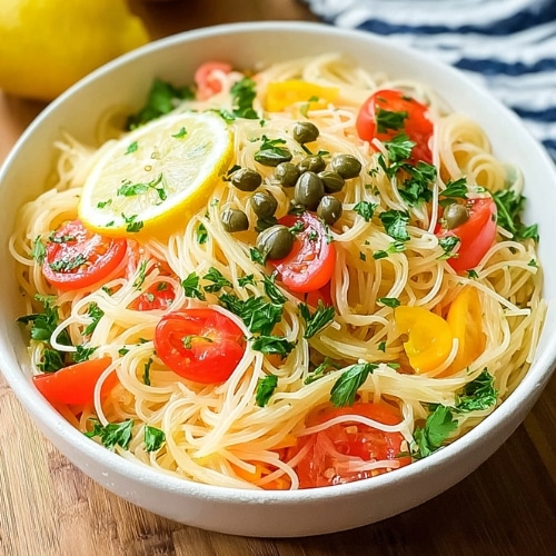 If you’re craving something light, bright, and refreshing, this Zesty Lemon Capellini Salad is your go-to. Delicate strands of capellini pasta are coated in a tangy lemon dressing, then tossed with juicy tomatoes, briny capers, and fresh parsley for a salad that’s bursting with flavor. It’s simple, elegant, and perfect for any season—whether as a quick lunch, a side dish for dinner, or a make-ahead salad for gatherings.